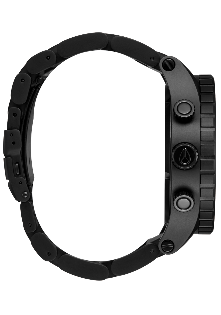 Fünf 13er markieren jede Stundenmarkierung um das Zifferblatt, wobei nur eine 13 leuchtend ist. Welche? Nun, das hängt davon ab, aus welchem Teil der Welt man sie bekommt. Die Drücker und die verschraubte Krone befinden sich auf der 9-Uhr-Seite des Gehäuses anstelle von 3 Uhr, um "Handgelenkbisse" bei aktiver Nutzung zu verhindern. Einseitig drehbare Lünette für einen analogen Countdown-Timer. Sechszeiger-Chronograph mit 24-Stunden-Timer und Sekunden-Timer-Totalisatoren, alle in Schwarz auf Schwarz.