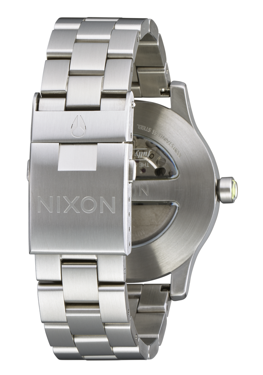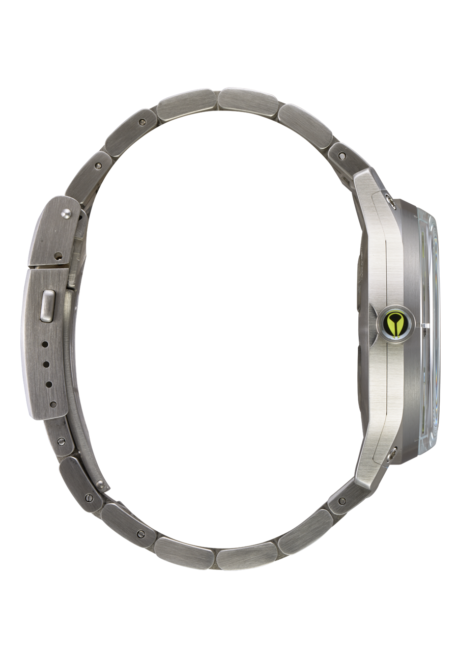 Das einzigartige zweiteilige Design eliminiert die Notwendigkeit eines traditionellen Gehäusebodens, während das geteilte Fenster einen Blick auf das Innenleben des automatischen Uhrwerks ermöglicht und die maßgeschneiderte Kristallform mit abgeschrägten Kanten nahtlos in das Gehäuse übergeht. Das gewölbte Zifferblatt verfügt über LUME-Blockindizes und LUME-Akzente auf den Zeigern für Sichtbarkeit auch bei schlechten Lichtverhältnissen.