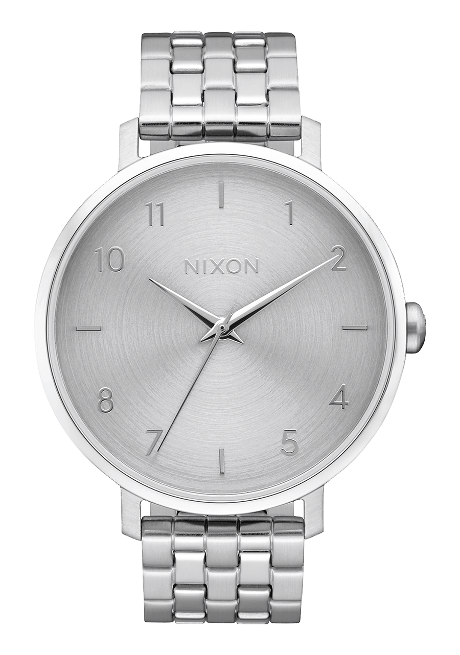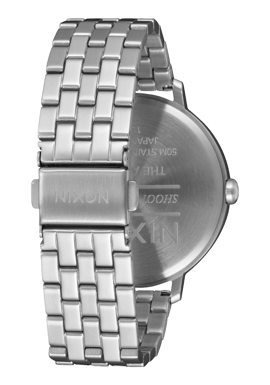 Zifferblatt mit aufgedrucktem Nixon-Schriftzug und Stundenmarkierungen in arabischer und Strichform. Ebenfalls mit gedruckten Zahlen und speziell geformten Zeigern ausgestattet.