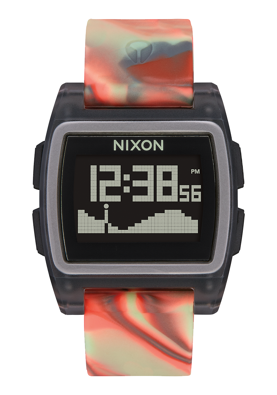 38 mm, 100 Meter/10 ATM, maßgefertigtes Spritzguss-TR90. Maßgefertigte, polycarbonatgedichtete Drücker, Edelstahl-Schraubboden und Edelstahl-Schraubstegösen.