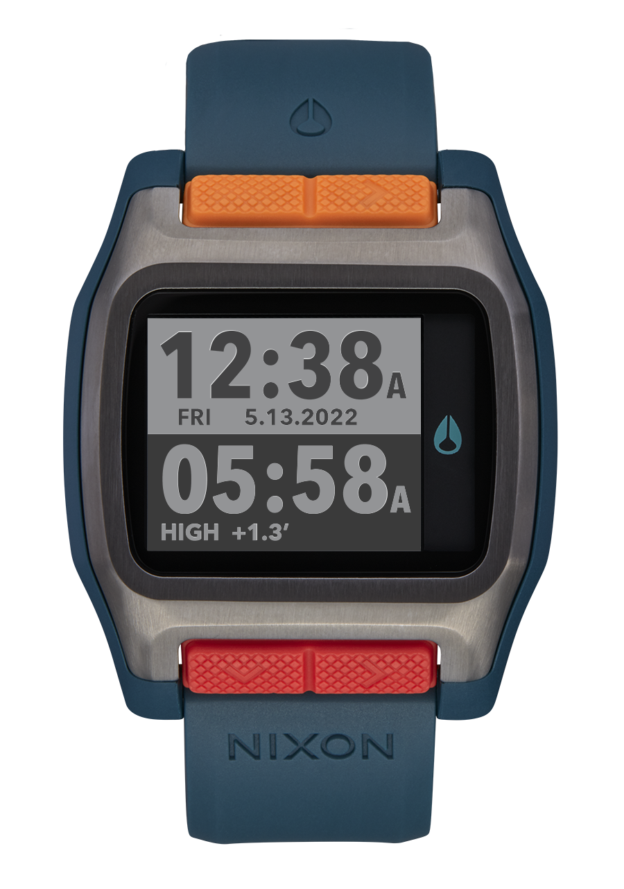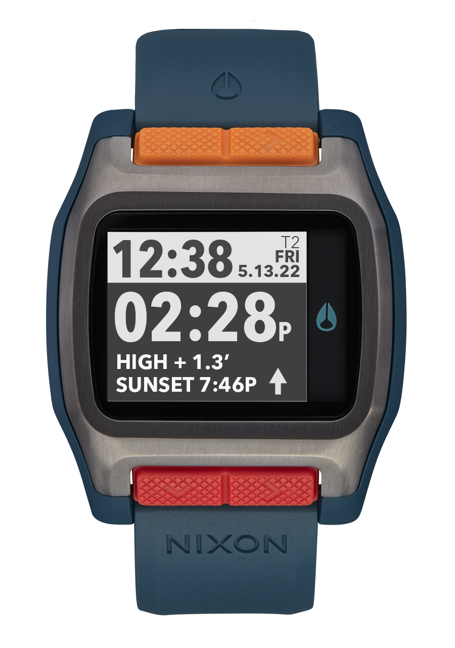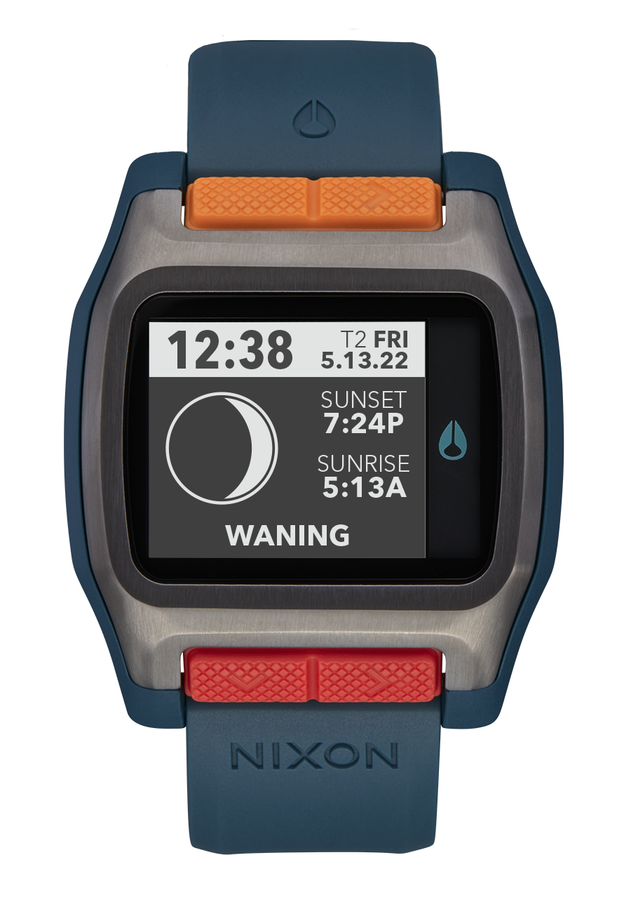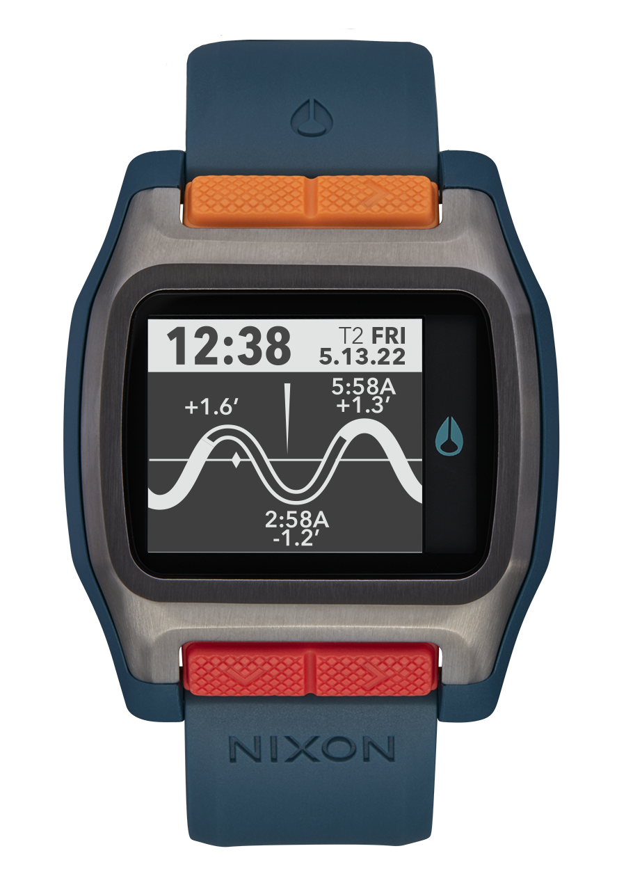 Maßgeschneidertes digitales Modul mit hochauflösendem MLCD mit Frontlicht, 550 vorprogrammierten Strandstandorten mit präzisen Gezeiten-, Sonnen- und Monddaten, Chronograph mit Aktionszeitstempel und Countdown-Timer.
