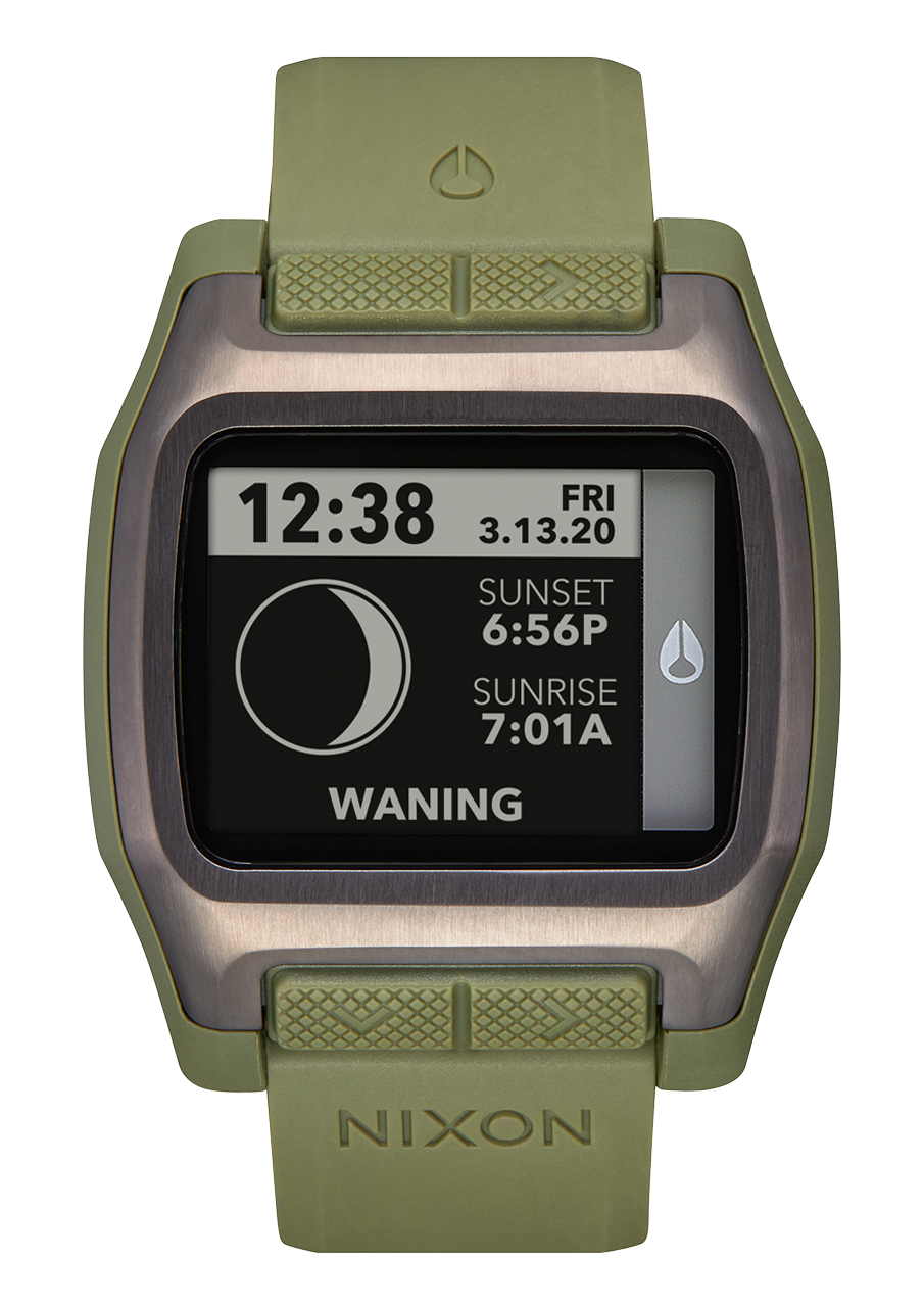 Maßgeschneidertes digitales Modul mit hochauflösendem MLCD mit Frontlicht, 550 vorprogrammierten Strandstandorten mit präzisen Gezeiten-, Sonnen- und Monddaten, Chronograph mit Aktionszeitstempel und Countdown-Timer.