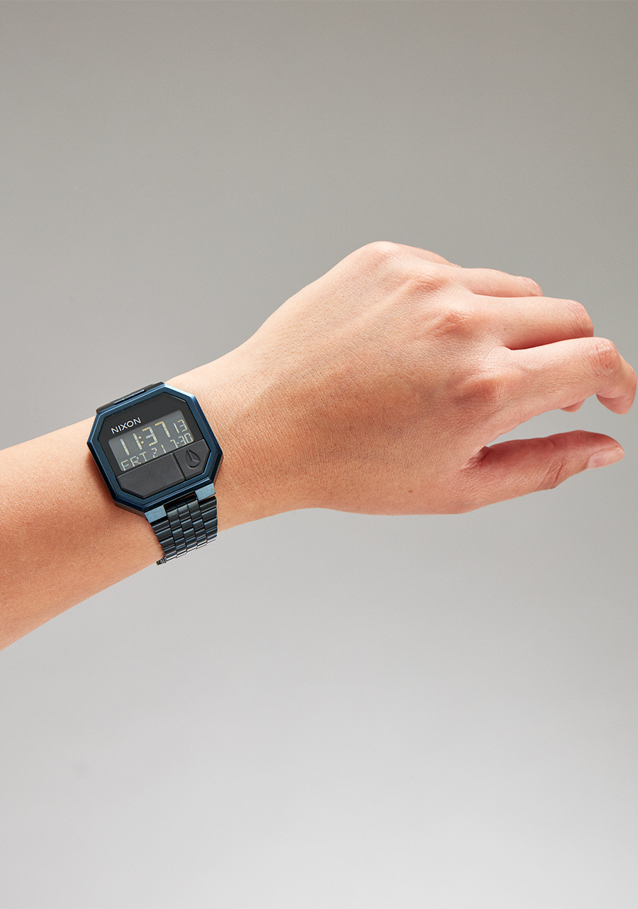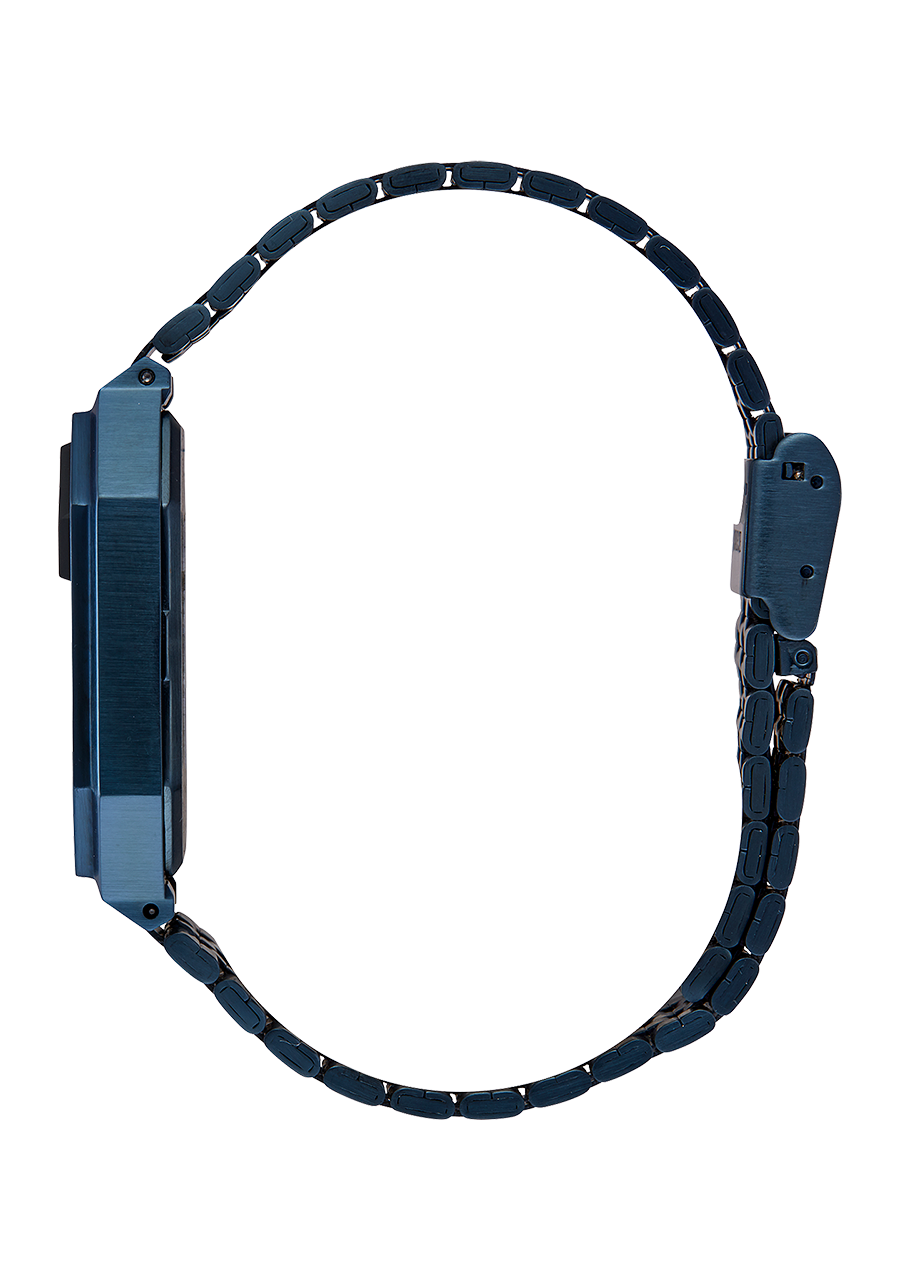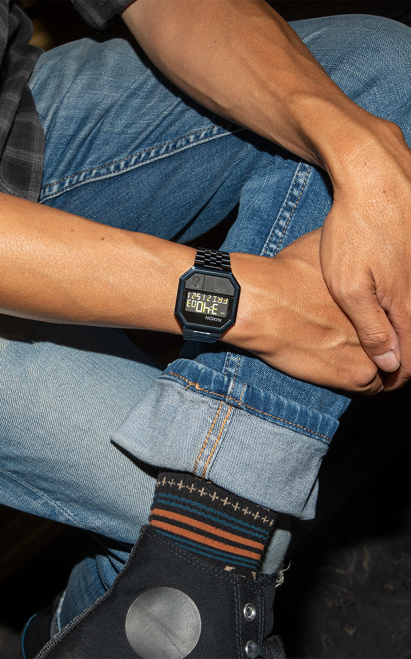 38,5 mm maßgefertigtes Gehäuse aus massivem Edelstahl mit einer Wasserdichtigkeit von 30 Metern / 3 ATM. Ausgestattet mit einem gehärteten Mineralglas, eingespritzten Polyurethan-Drückern, massivem Edelstahl-Schnappgehäuseboden und Federsteg-Pins.