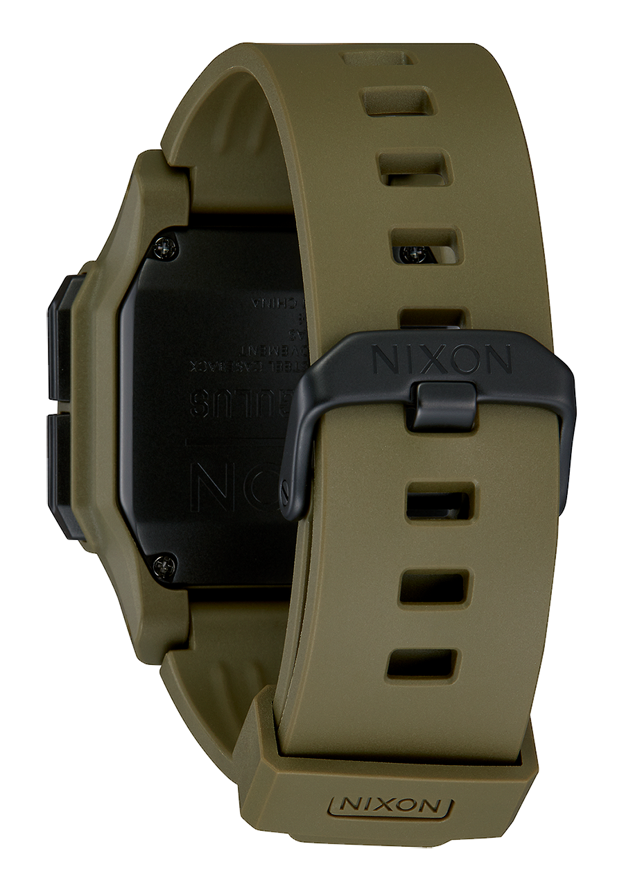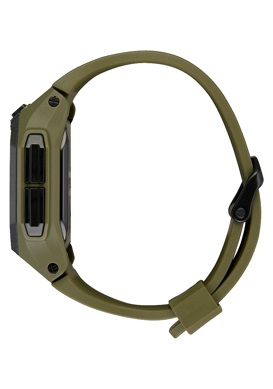 46 mm maßgefertigtes, spritzgegossenes TR-90-Gehäuse mit einer Wasserdichtigkeit von 100 Metern / 10 ATM. Maßgeschneidertes digitales LCD-Modul, eingebettet in eine schützende PU-Hülle und Poron-Schaumpolsterung. Ausgestattet mit Polycarbonat-Drückern bei 6 und 9 Uhr, gehärtetem Mineralglas, Edelstahl-Lünette, massivem Edelstahl-Schraubboden und Schraubstiftanstößen.