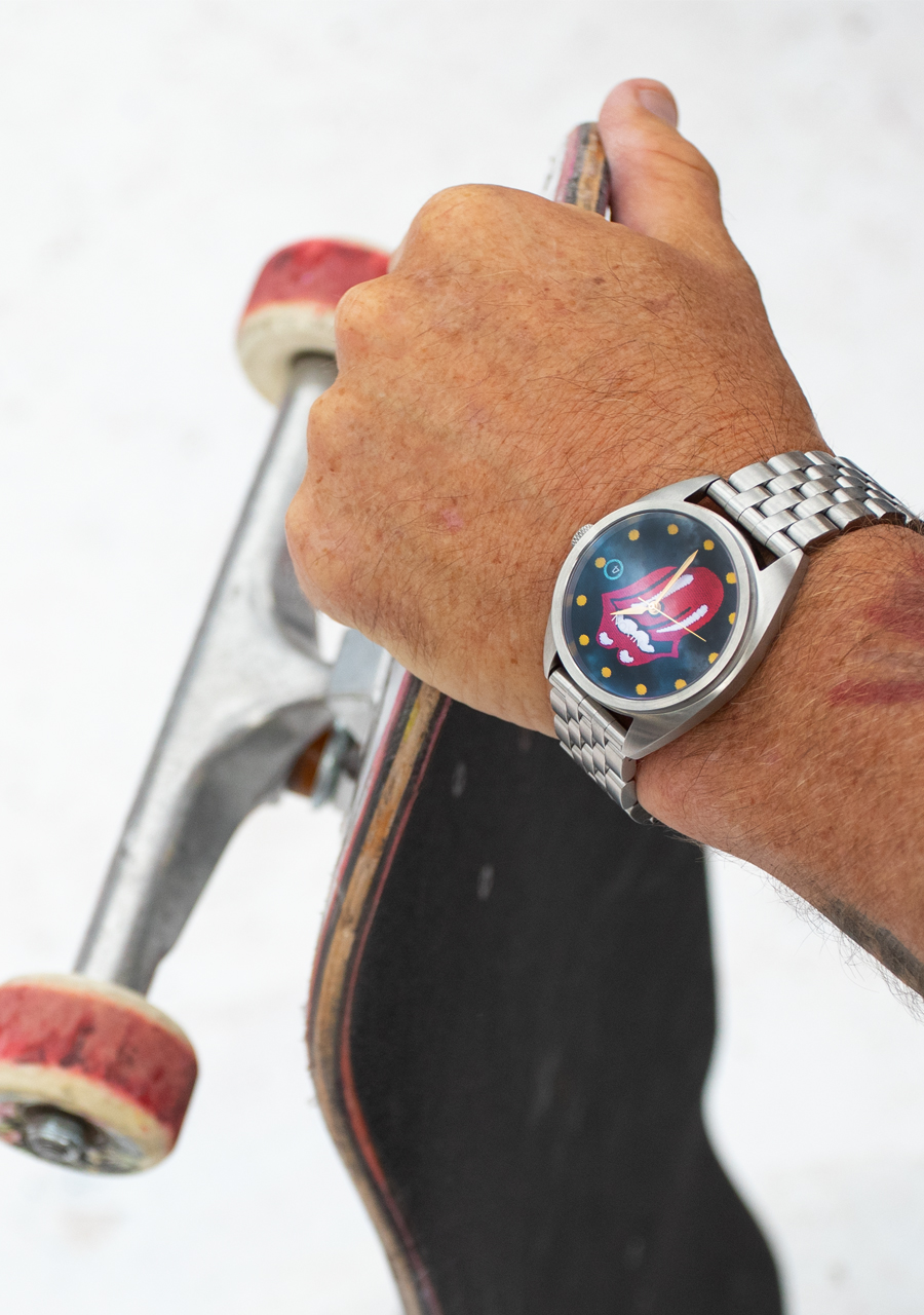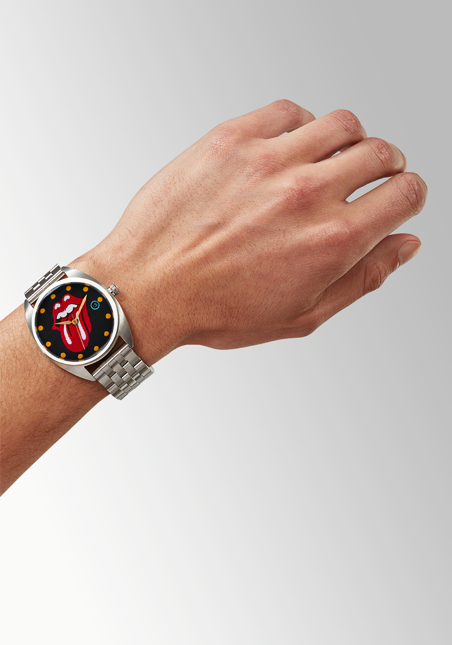 Das Zifferblatt verfügt über applizierte Indizes und speziell geformte Zeiger. Es zeigt die klassische Rolling Stones Zunge, goldene umlaufende Indizes und ein blau hervorgehobenes Datumsfenster.