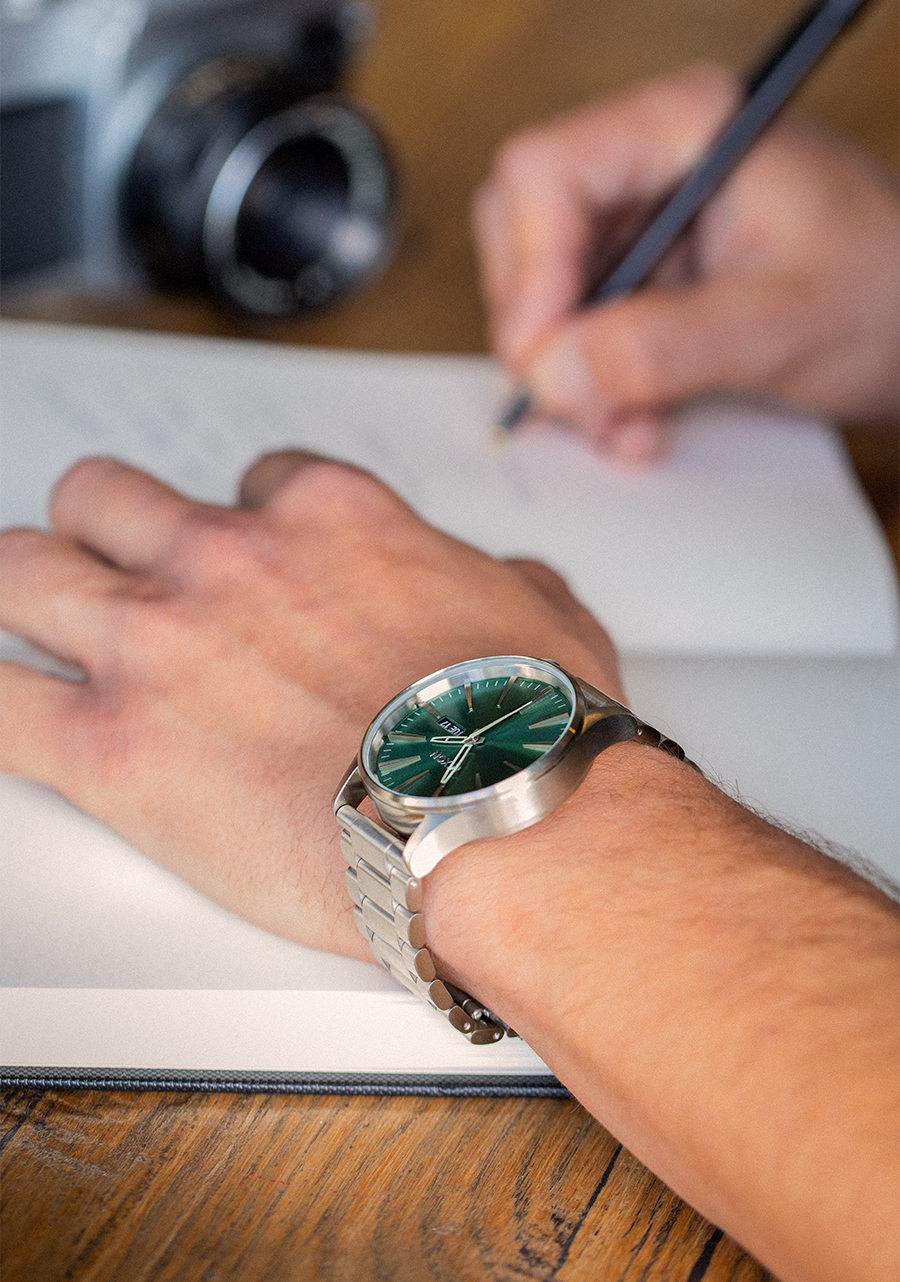 42mm maßgefertigtes Gehäuse aus massivem Edelstahl mit einer Wasserdichtigkeit von 100 Metern / 10 ATM. Ausgestattet mit einem gehärteten Mineralglas, einer Krone mit dreifacher Dichtung und Emaillefüllung, einem verschraubten Edelstahl-Gehäuseboden und Federsteganstößen.