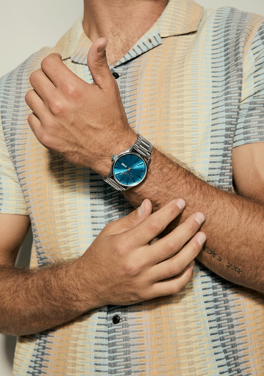 Lehnen Sie sich den ganzen Tag am Pool mit der brandneuen Aquatic Kollektion zurück. Mit der Time Teller, Sentry Stainless Steel und Stinger 44 werden diese klassischen silbernen Uhren mit lebendigen und satten Blautönen gefüllt, um Ihre Reise vom Liegestuhl bis zum tiefen Ende zu begleiten.