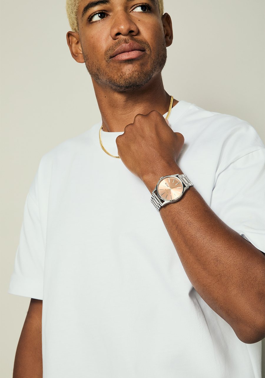 Aufgesetzte Indizes verleihen dem Zifferblatt dieser klassischen Alltagsuhr Tiefe und Dimension.