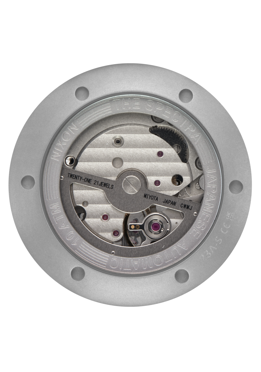 Das Skelettzifferblatt zeigt das automatische Uhrwerk. Das Zifferblatt verfügt über aufgesetzte, dreidimensionale Stabindizes. Das Nixon-Logo ist auf der Unterseite des Uhrglases angebracht, um zusätzliche Tiefe zu verleihen.