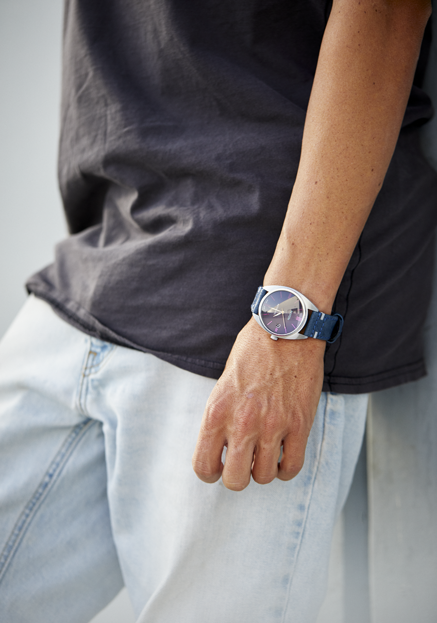 Das Zifferblatt verfügt über aufgesetzte Stabindizes und speziell geformte Zeiger.