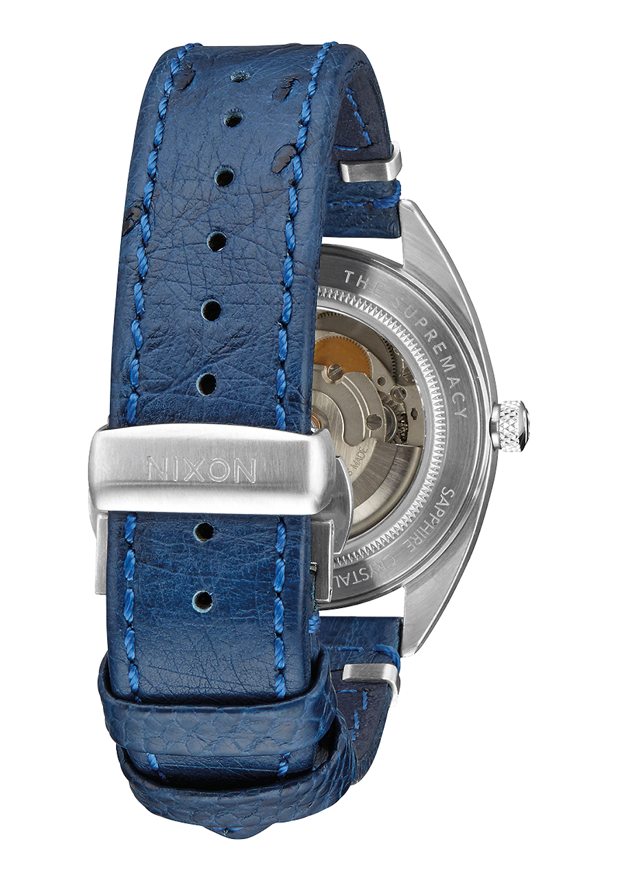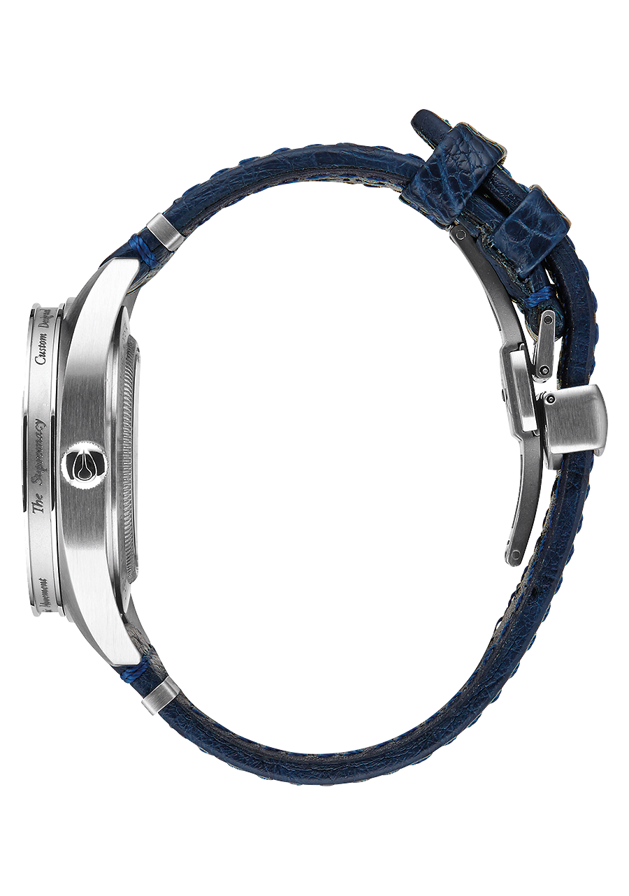 20 mm gebürstetes Edelstahlarmband mit einer maßgefertigten, massiven Edelstahl-Faltschließe. Alternativarmband ist ein Horween Aniline Chromexcel schwarzes Band mit gebürsteter Edelstahl-Faltschließe.