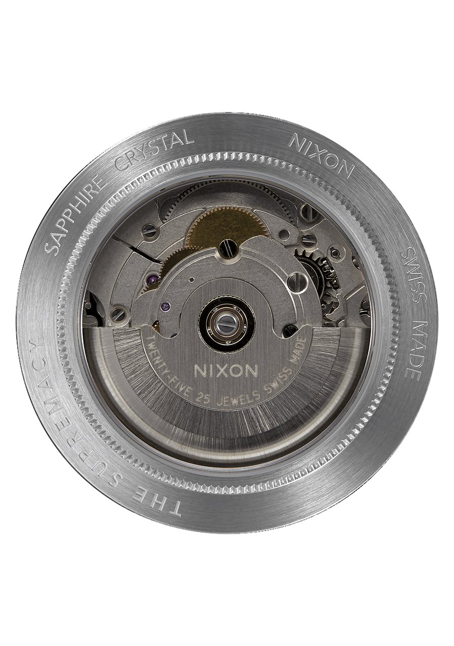 40 mm maßgefertigtes Gehäuse aus massivem Edelstahl und feste Lünette mit einer Wasserdichtigkeit von 100 Metern / 10 ATM. Das Gehäuse verfügt über eine kratzfeste Beschichtung und die Lünette ist seitlich graviert. Enthält eine verschraubte Krone mit dreifacher Dichtung und Rändelstruktur sowie ein gewölbtes Saphirglas mit Antireflexbeschichtung auf der Unterseite. Jeder verschraubte Edelstahl-Gehäuseboden ist einzeln nummeriert und besitzt ein gehärtetes Mineralglasfenster sowie Federsteganstöße.