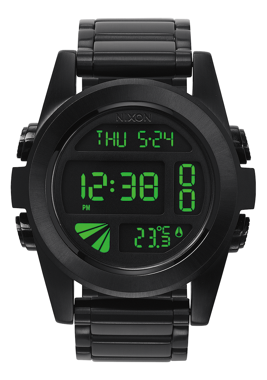Individuelles digitales Uhrwerk mit Negativanzeige, 12- oder 24-Stunden-Zeit, Kalender, Temperaturanzeige, Dualzeit, Countdown-Timer, Chronograph, Alarm und Lichtfunktionen.